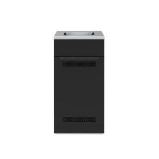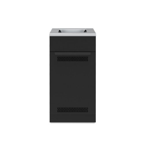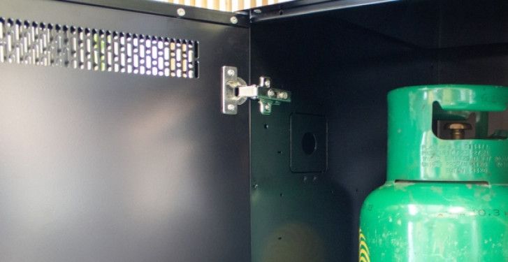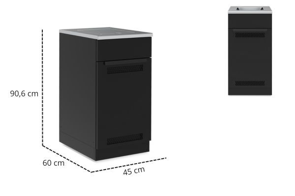 Szafka do zabudowy Baron butla/kuchenka to funkcjonalny element modułowej kuchni ogrodowej umożliwiający wygodne przechowywanie butli gazowej oraz montaż kuchenki w przygotowanym otworze. Otwory wentylacyjne w dolnej i górnej części drzwi gwarantują optymalną cyrkulację powietrza, zapewniając bezpieczeństwo użytkowania. Moduł wyposażono w cztery regulowane nóżki, które pozwalają na precyzyjne wypoziomowanie i zapewniają stabilność całej konstrukcji, a także maskujące je z przodu i z tyłu cokoły. Zawiasy z funkcją cichego domyku sprawiają, że drzwi otwierają się i zamykają płynnie oraz bezgłośnie. Wszystkie zewnętrzne elementy szafki poddano procesowi galwanizacji (co zwiększa ich odporność na korozję), a całość pokryto czarną farbą proszkową. Blat wykonany ze stali szlachetnej zapewnia wysoką trwałość i odporność na warunki atmosferyczne.
