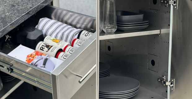 Szafka drzwi/szuflada to gwarancja maksymalnej organizacji. Została wyposażona w przestronną szufladę oraz dwie praktyczne półki, dzięki którym z łatwością uporządkujesz wszystkie akcesoria, naczynia i narzędzia, jakie potrzebne są w Twojej kuchni na świeżym powietrzu.