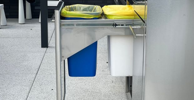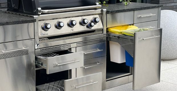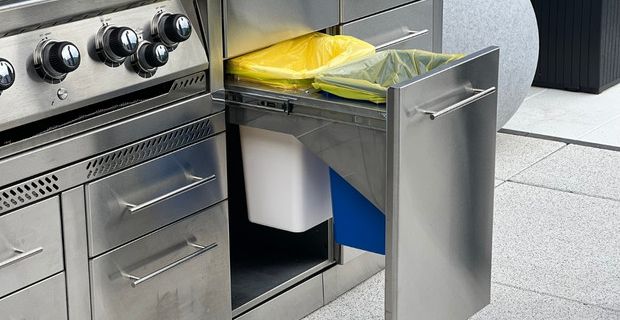 Dwa zintegrowane pojemniki na odpady zapewniają wyznaczone miejsce do szybkiej i wygodnej segregacji śmieci w strefie grillowania. Dzięki temu łatwo utrzymasz idealny ład w modułowej kuchni ogrodowej.