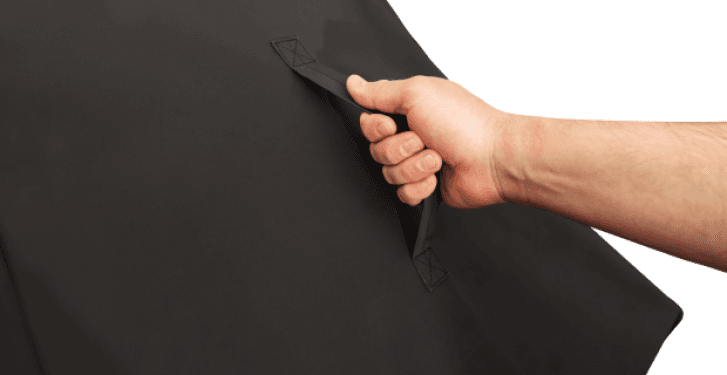 Wszyte po bokach uchwyty ułatwiają szybkie zdejmowanie i zakładanie pokrowca, nawet gdy materiał jest wilgotny lub zimny. Dzięki nim obsługa pokrowca jest prosta i wygodna w każdych warunkach.