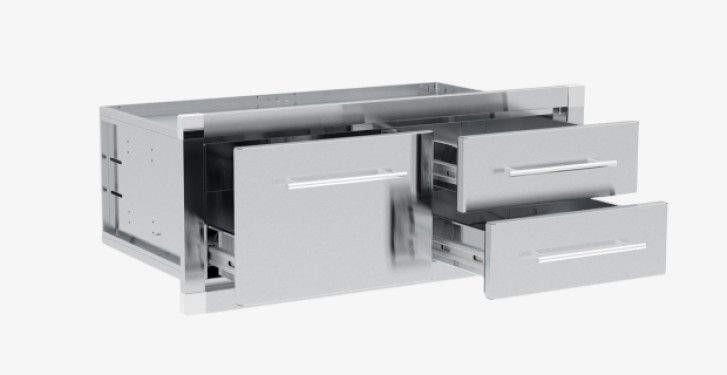 Wkład 2+1 szuflady to praktyczny element zabudowy zaprojektowany z myślą o osobach tworzących niestandardowe kuchnie ogrodowe. Można wkomponować go w różnego rodzaju zabudowy od murowanych po kompozytowe, co daje pełną swobodę aranżacji i dopasowanie do własnej koncepcji kuchni. Wkład wyróżnia się poziomym układem z jedną dużą szufladą po lewej stronie oraz dwiema mniejszymi po prawej, co sprawia, że świetnie sprawdza się jako element zabudowy nie tylko pod blatem roboczym, ale również tuż pod grillem do zabudowy. Szuflady oferują wygodną przestrzeń do przechowywania narzędzi grillowych, akcesoriów oraz zapasów, ułatwiając utrzymanie porządku w kuchni ogrodowej. Wład wykonany został z wysokogatunkowej stali szlachetnej 304, odpornej na warunki atmosferyczne, co gwarantuje trwałość i estetyczny wygląd przez wiele lat użytkowania. Prowadnice z cichym domykiem zapewniają płynne i bezgłośne zamykanie, a gumowe uszczelki skutecznie chronią wnętrze przed kurzem i wilgocią. Po osadzeniu w zabudowie widoczne są fronty szuflad oraz listwa frontowa, co nadaje kuchni ogrodowej spójny i elegancki wygląd.