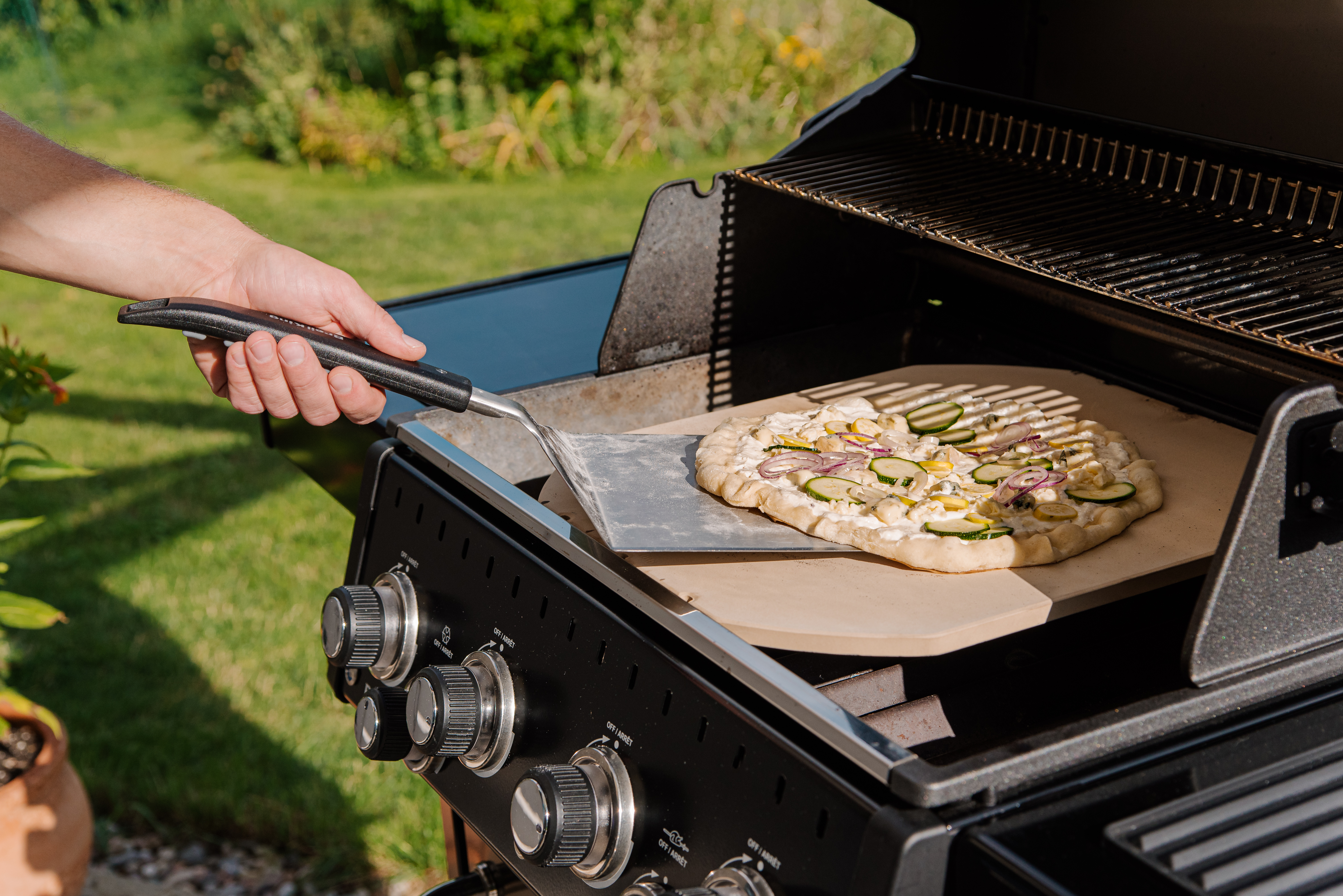 💡 Podczas pieczenia pizzy można użyć również palnika rożna (w grillach, które zostały w niego wyposażone). Dodatkowy tylny palnik pozwala uzyskać jeszcze większą chrupkość. Należy jednak pamiętać, by obrócić pizzę na kamieniu w trakcie grillowania, w celu równomiernego wypieczenia i uniknięcia przypalenia.
