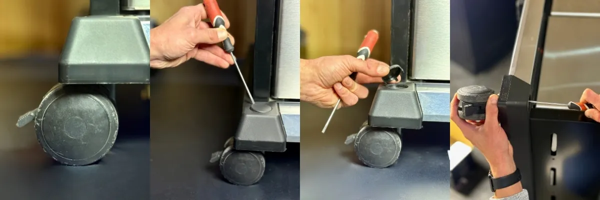 Po ustawieniu grilla na plecach i stabilnym oparciu go o tylną konstrukcję uzyskuje się swobodny dostęp do fabrycznych kółek. Nie są potrzebne żadne specjalne narzędzia poza bitem Robertsona (do odkręcenia śrub w modelach Regal™ oraz Imperial™) lub płaskim śrubokrętem, który pomoże zwolnić blokady z trzpieni w modelach Baron™ i Crown™. Cały proces jest szybki i zajmuje tylko kilka minut.