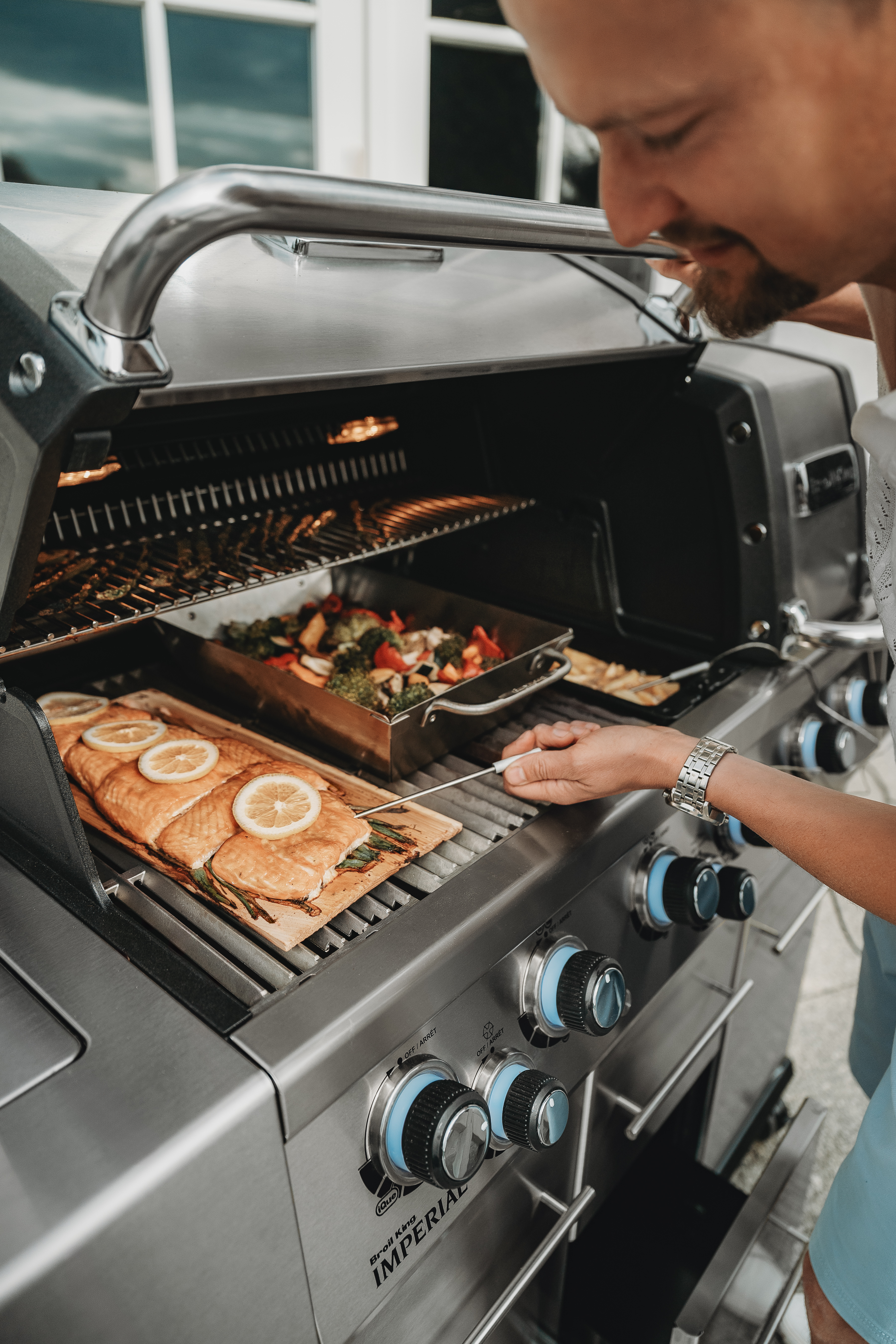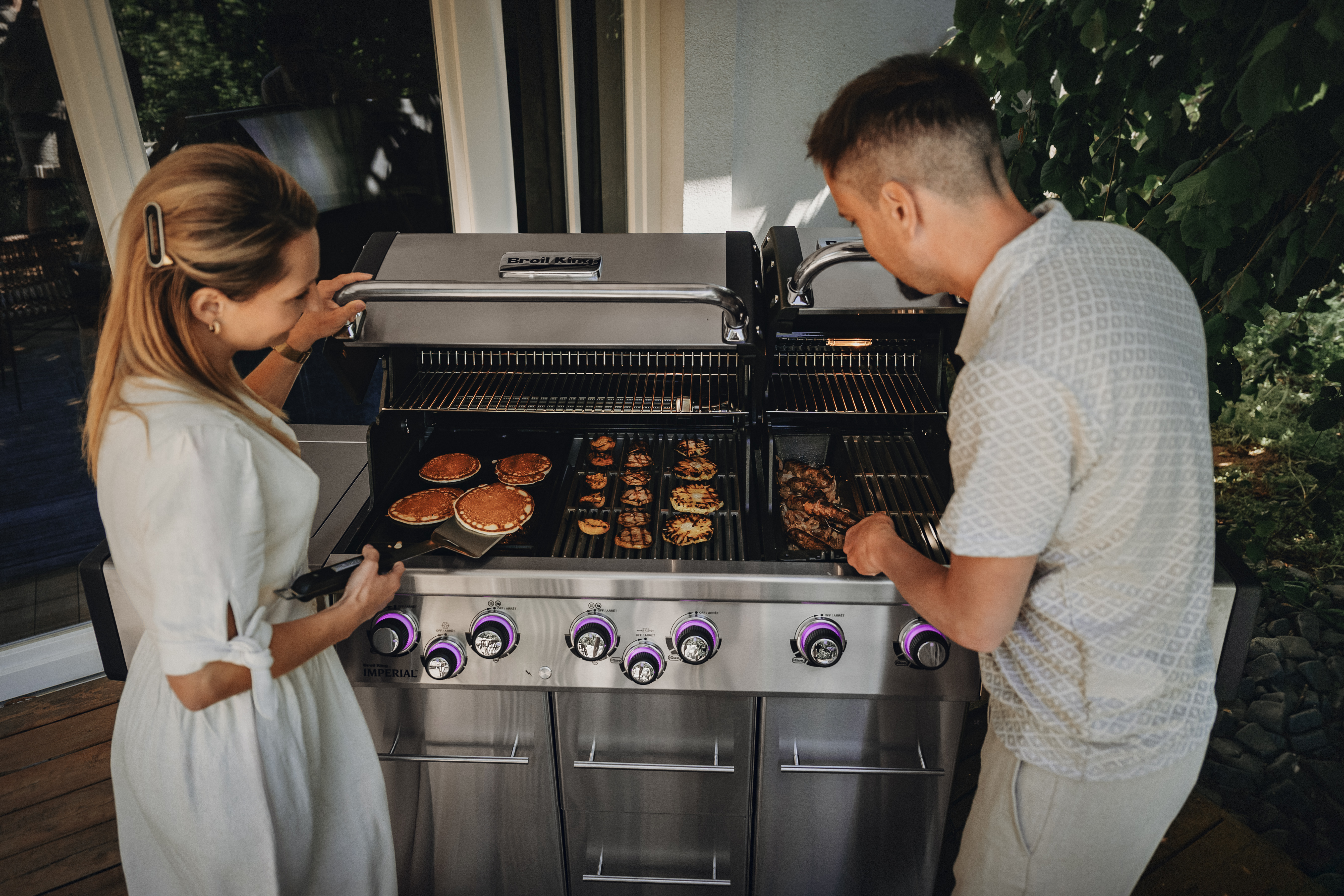 Grille gazowe 6-palnikowe z oferty Broil King dostępne są w serii Imperial™. Są to grille ogrodowe, które wyróżniają nie tylko duże rozmiary, ale także obecność dwóch niezależnych piekarników. Dzięki takiemu rozwiązaniu zyskujesz możliwość dostosowania grillowania na świeżym powietrzu do sytuacji. Gdy przygotowujesz szybki posiłek, wystarczy uruchomić palniki na panelu pod mniejszym piekarnikiem i bez zbędnego zużycia gazu przyrządzić steka, kilka kiełbasek czy porcję warzyw. Natomiast gdy gościsz większą liczbę osób jednocześnie, możesz wykorzystać oba piekarniki, uzyskując dużą powierzchnię grillowania.