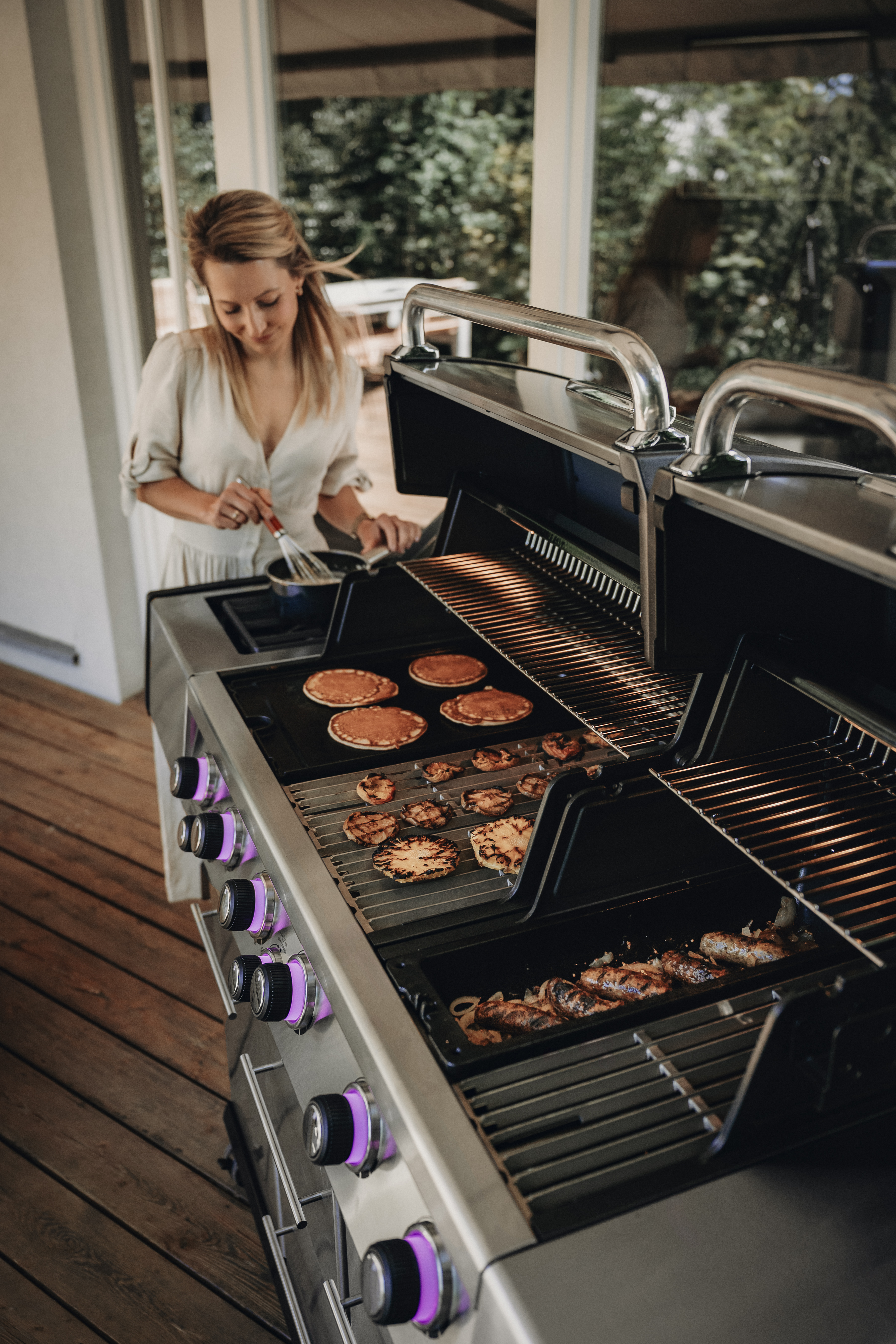 W grillach gazowych 6-palnikowych Broil King znajdziesz nie tylko dużą powierzchnię grillowania, ale także praktyczne rozwiązania w postaci rożna obrotowego i/lub palnika bocznego. Palnik boczny to doskonała alternatywa dla tradycyjnej kuchenki w domu i daje możliwość wielofunkcyjnego wykorzystania grilla ogrodowego. Idealnie sprawdzi się zarówno do podgrzewania wcześniej przygotowanego jedzenia, jak i do gotowania od podstaw dań jednogarnkowych od aromatycznych zup po gęste sosy. Dzięki temu zyskujesz jeszcze większą swobodę w przygotowywaniu różnorodnych potraw w ogrodzie czy na tarasie bez potrzeby wracania do kuchni. Rożen pozwoli Ci zaś upiec soczystego kurczaka, pieczeń czy domowego kebaba bez potrzeby ciągłęgo doglądania.