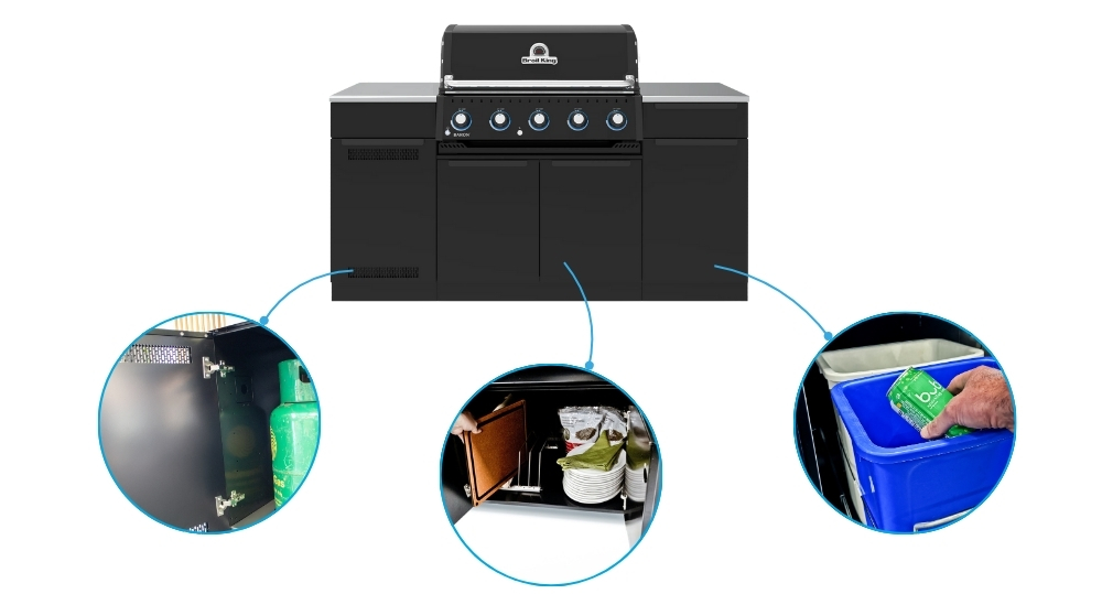 Baron™ 520 Shadow Wyspa to kompletna kuchnia ogrodowa, na której grillować można niemal od razu po montażu. Sprawdzone rozwiązania wykorzystane w grillu Baron™ 520 Shadow do zabudowy gwarantują doskonały smak i aromat przygotowywanych potraw. Przestronne szafki pozwalają pomieścić ulubione narzędzia i akcesoria, dwa kosze ułatwią segregację odpadów, a szafka na butlę zapewnia bezpieczeństwo podczas grillowania.