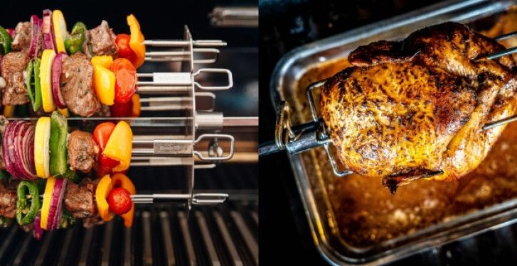 Będący częścią grilla zestaw rożna obrotowego pozwoli Ci uzyskać perfekcyjnie wypieczone potrawy. Powolne, równomierne obracanie sprawia, że mięso pozostaje soczyste w środku i chrupiące na zewnątrz. Idealne rozwiązanie do przyrządzania kurczaka, pieczeni, a przy użyciu zestawu szpikulców - również szaszłyków.