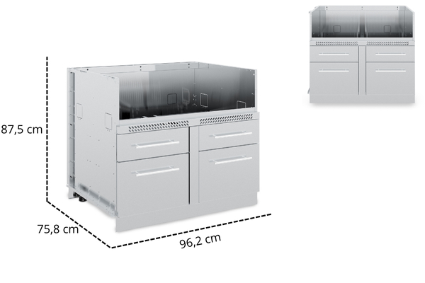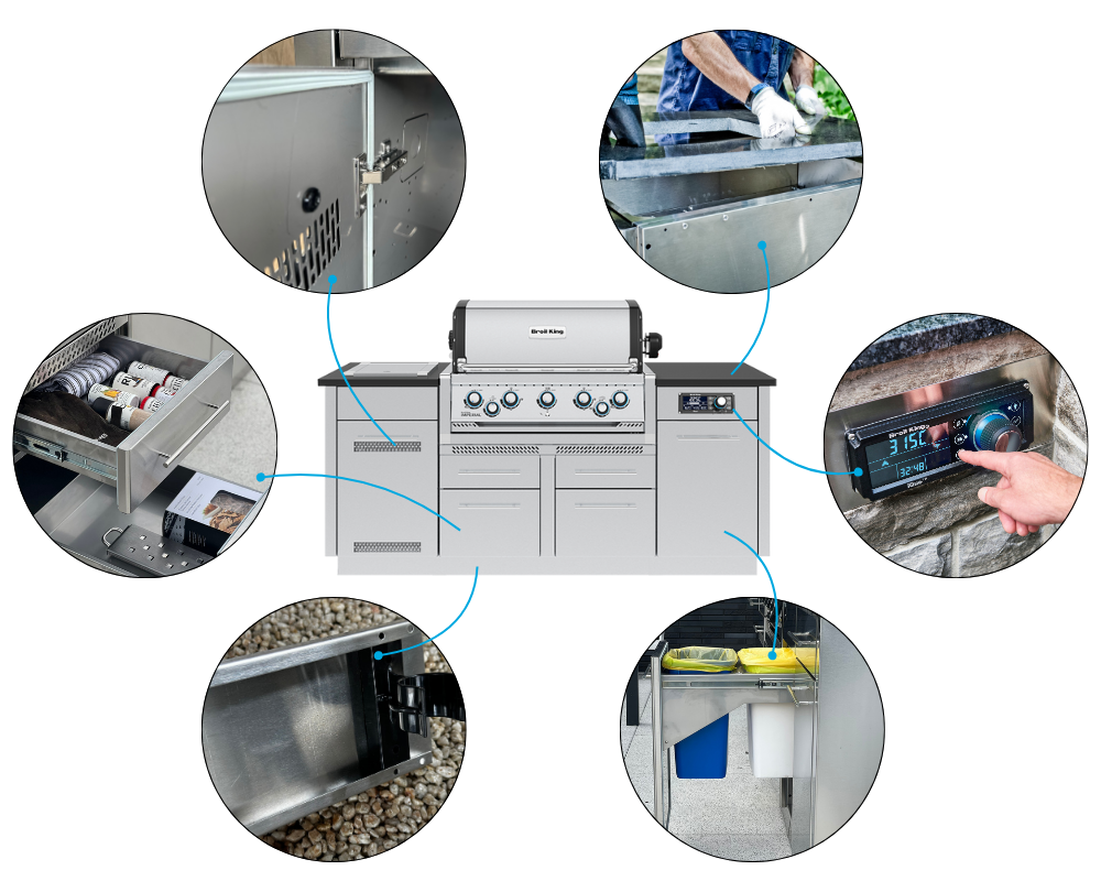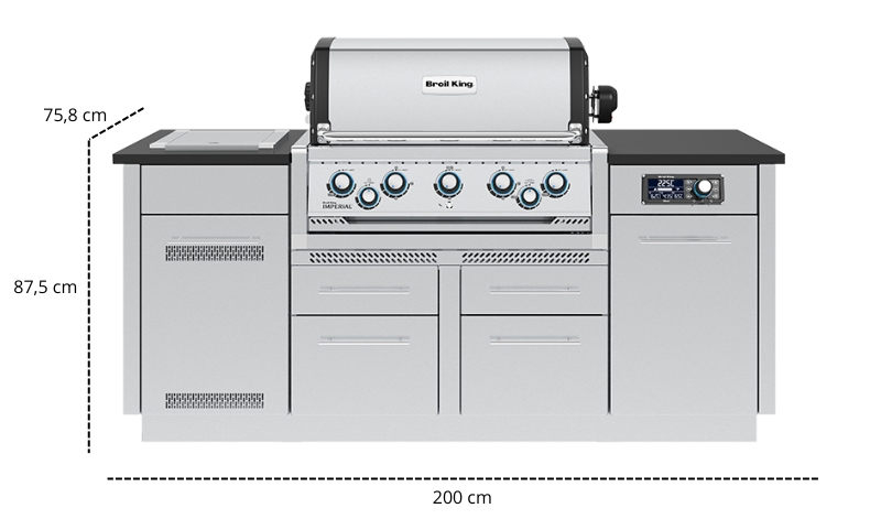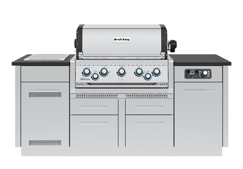 Imperial™ QS 590 Wyspa to gotowa, modułowa kuchnia ogrodowa zaprojektowana z myślą o maksymalnej wygodzie i funkcjonalności. Sprawdzone rozwiązania Broil King zastosowane w grillu Imperial™ QS 590 do zabudowy pozwolą Ci przyrządzić pyszne i aromatyczne potrawy. Przestronne szafki pomieszczą niezbędne akcesoria i narzędzia, dwa osobne kosze ułatwią zarządzanie odpadami, a szafka na butlę gazową zapewni bezpieczeństwo grillowania.