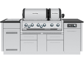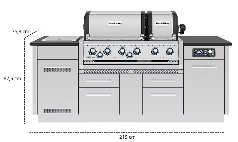 Imperial™ QS 690 Wyspa to gotowa, modułowa kuchnia ogrodowa zaprojektowana z myślą o maksymalnej wygodzie i funkcjonalności. Sprawdzone rozwiązania Broil King zastosowane w grillu Imperial™ QS 690 do zabudowy pozwolą Ci przyrządzić pyszne i aromatyczne potrawy. Przestronne szafki pomieszczą niezbędne akcesoria i narzędzia, dwa osobne kosze ułatwią zarządzanie odpadami, a szafka na butlę gazową zapewni bezpieczeństwo grillowania.