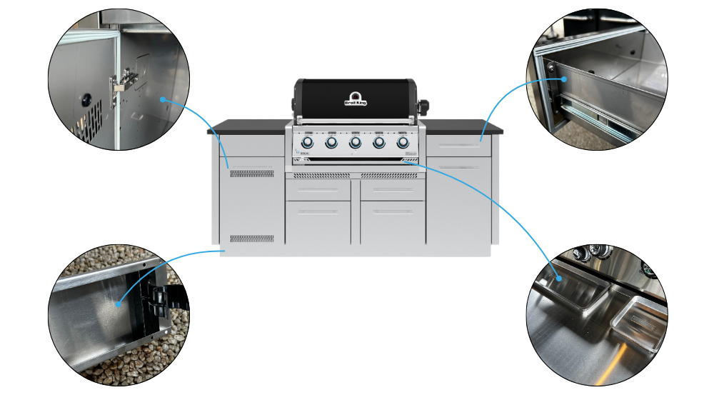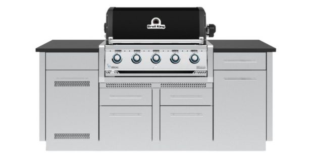 Regal 520 Wyspa to gotowa, modułowa kuchnia ogrodowa zaprojektowana z myślą o maksymalnej wygodzie i funkcjonalności. Sprawdzone rozwiązania Broil King zastosowane w grillu Regal 520 do zabudowy pozwolą Ci przyrządzić pyszne i aromatyczne potrawy. Przestronne szafki pomieszczą niezbędne akcesoria i narzędzia, dwa osobne kosze ułatwią zarządzanie odpadami, a szafka na butlę gazową zapewni bezpieczeństwo grillowania.