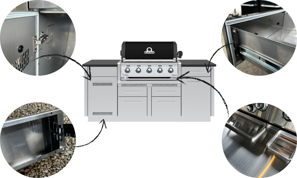 W dowolnym momencie możliwe jest dołączenie do wyspy kolejnych modułów ze stali szlachetnej (szafki na akcesoria, lodówka). Dzięki temu kuchnia ogrodowa może rozwijać się wraz ze zmieniającymi się preferencjami i rosnącymi wymaganiami użytkowników.