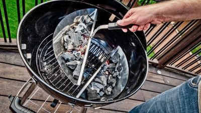 Emaliowany ruszt unosi węgiel nad dno paleniska, zapewniając stały dopływ powietrza od spodu, dzięki czemu węgiel pali się równomiernie. Będące częścią wyposażenia dwa stalowe kosze na więgiel umożliwiają ustawienie stref żaru - mocnej do grillowania bezpośredniego oraz łagodniejszej do grillowania pośredniego i dopiekania potraw.