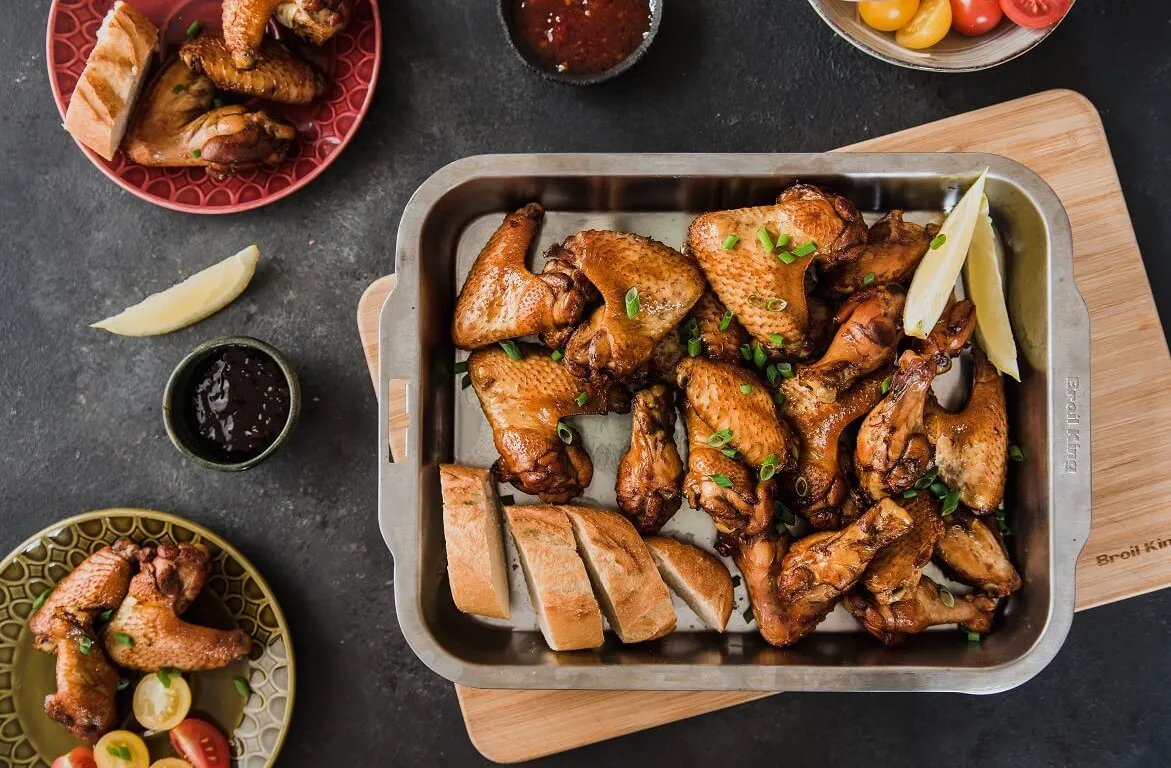 Po 30 minutach przekręć palnik do pozycji MEDIUM. Grilluj do czasu uzyskania przez skrzydełka temperatury wewnętrznej 80 stopni C, czyli łącznie ok 45-50 minut. Podawaj od razu po przygotowaniu z chrupiącym pieczywem, ulubionymi warzywami oraz sosami.