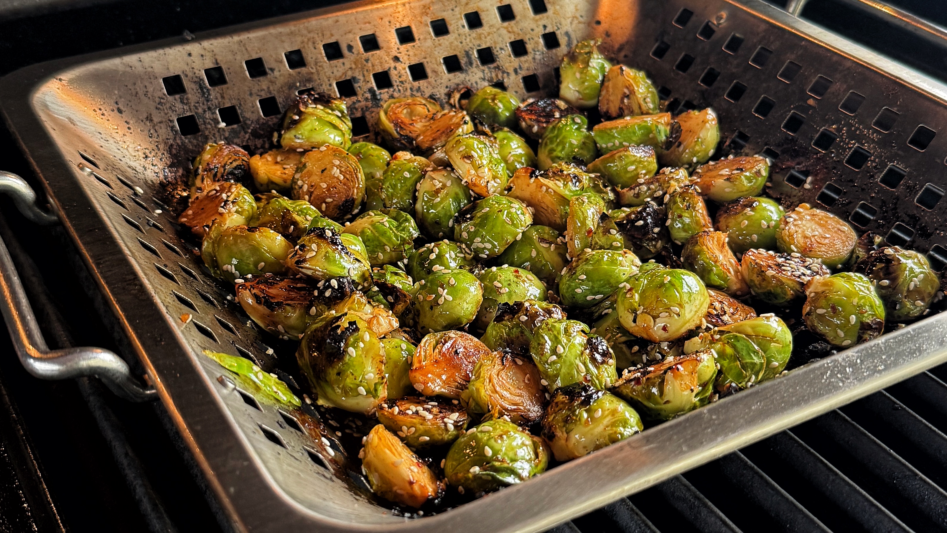 Brukselki przekrój wzdłuż na pół, przełóż do miski i wymieszaj z dwiema łyżkami sosu. Do grillowania użyj stalowej brytfanny z otworami, dzięki niej brukselkę łatwo przemieszasz, a otwory zapewnią lepszy obieg gorącego powietrza. Warzywa nie będą się dusić, a grillować zyskując przyjemnie chrupiącą strukturę. Grilluj na medium (ok. 180-200°C) przez 15-18 minut, co kilka minut mieszając. Gotową brukselkę posyp ziarnami sezamu.