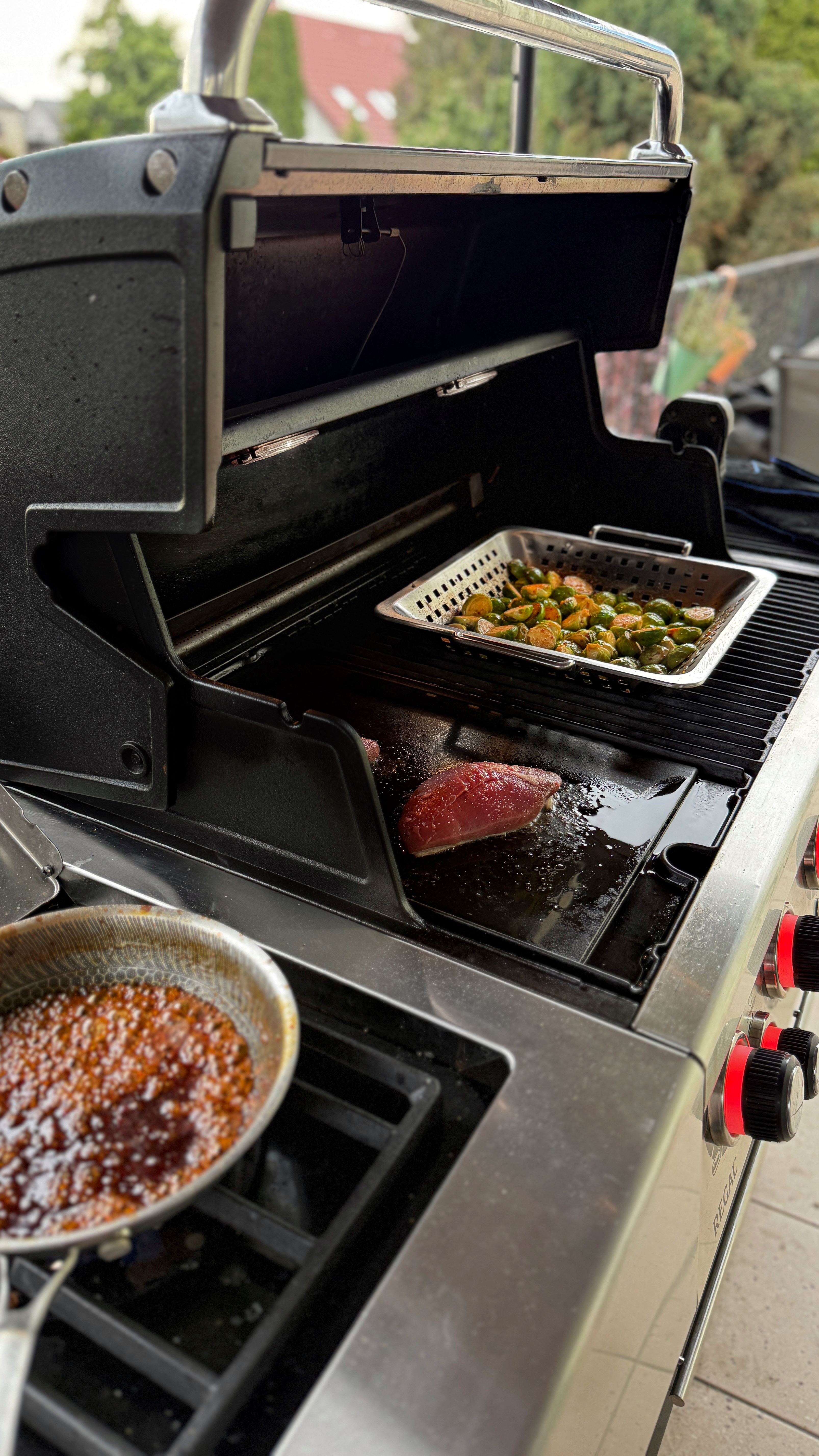 Odpal palnik kuchenki bocznej w grillu gazowym. W garnku (dobrze sprawdzi się rondelek Broil King) połącz wszystkie składniki na sos do brukselki. Doprowadź do wrzenia, a następnie gotuj na małym ogniu, powoli redukując, aż sos wyraźnie zgęstnieje.