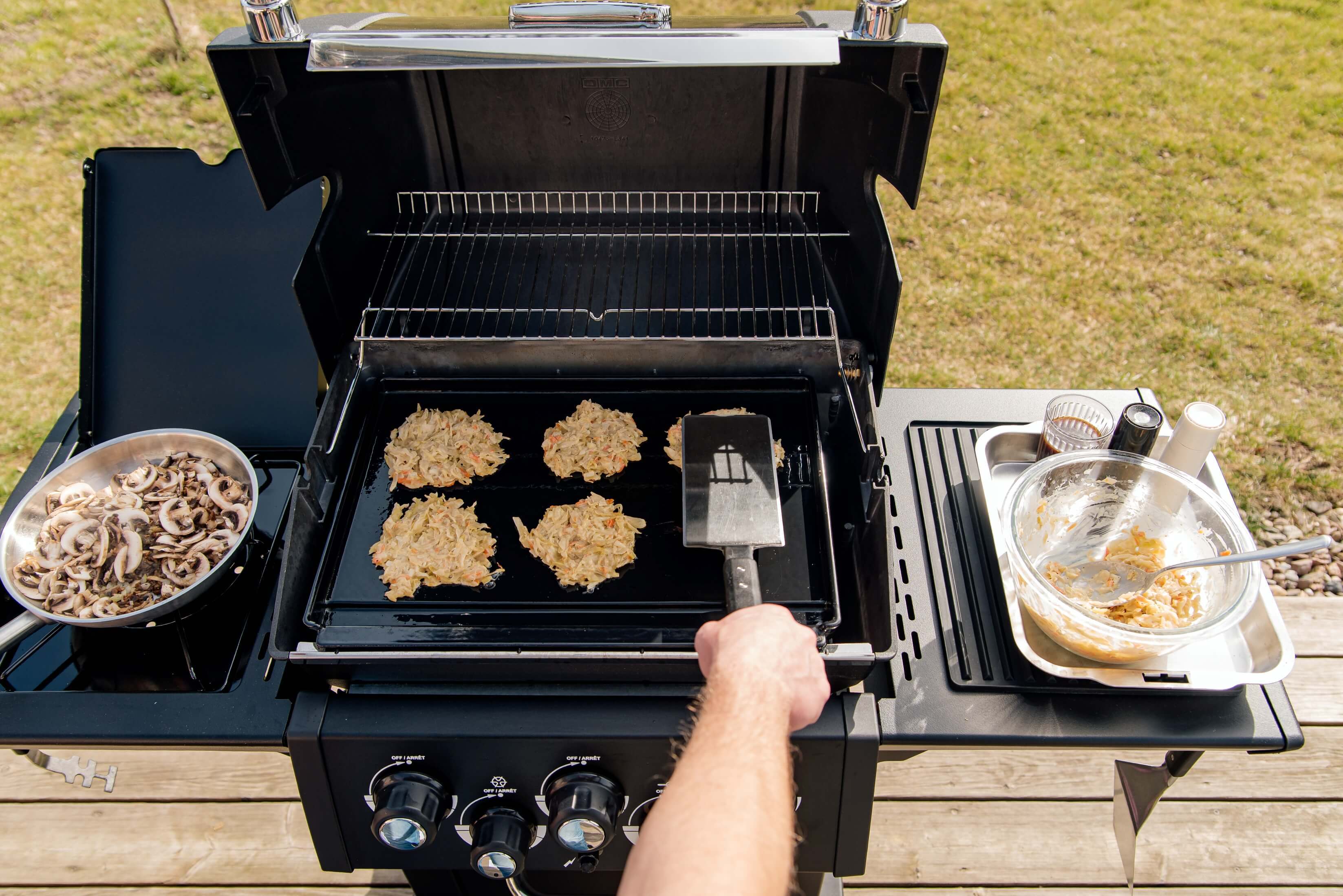 Za pomocą uchwytu wielofunkcyjnego wyjmij ruszt i w jego miejsce umieść dedykowaną planchę żeliwną. Rozgrzej grill. Pod planchą ustaw średnią moc palników - docelowa temperatura powierzchni ok. 180-200°C.