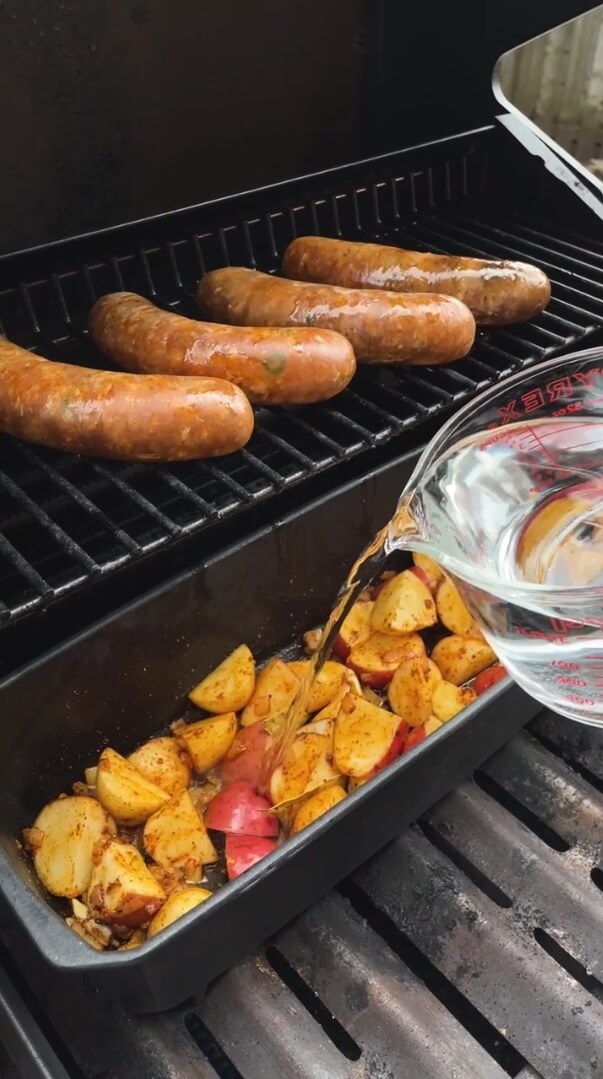 Czas na dodanie reszty składników. Kiełbasę pokrój w nieco grubsze plasterki, każdą kolbę kukurydzy podziel na 3 w miarę równe części. Pozostałe 4 ząbki czosnku pokrój na drobną kostkę i odłóż na bok, będziesz go potrzebował później. Otwórz pokrywę grilla i zdejmij wieko z brytfanny, najlepiej jak na ręce założysz rękawice skórzane, ochronią Cię przed poparzeniem. Zobacz, czy ziemniaki są gotowe, mają być lekko niedogotowane. Jeśli nie są jeszcze gotowe, grilluj je jeszcze przez 2-3 minuty. Następnie dodaj do brytfanny pokrojoną kiełbasę i kukurydzę. Grilluj przez 5 minut, kiełbasa, która wcześniej była niedopieczona, teraz będzie gotowa do spożycia.
