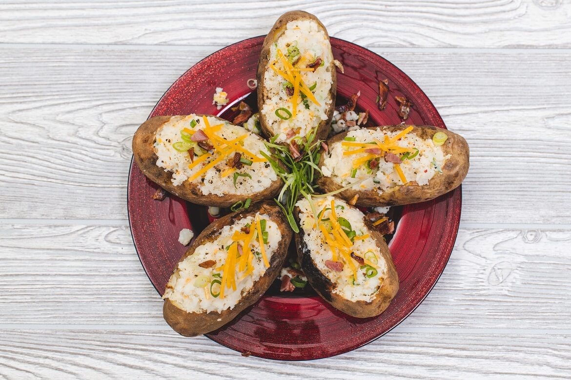 Rozgrzej grill z palnikami ustawionymi na MEDIUM, w przypadku grilli Pellet wybierz tryb PIECZENIE (177°C). Przygotowane ziemniaki połóż na górnej półce grilla i pozostaw do pieczenia przez około godzinę i 15 minut, obracając co jakiś czas. Najlepiej spiszą się szczypce o dużej powierzchni chwytu np. szczypce Imperial. Sprawdź wykałaczką, czy już są miękkie w środku. Następnie odstaw na 15 minut do ochłodzenia się. W tym czasie pokrój boczek w mniejszą kostkę i podsmaż w rondelku na kuchence bocznej grilla. Odetnij górną część (za chwilę się przyda) i delikatnie łyżeczką wybierz 1,5 cm miąższu, zrób małą miseczkę na dodatki. Wybrany miąższ ziemniaczany utłucz na kremową konsystencję, następnie dodaj wszystkie składniki (pozostaw trochę sera cheddar, boczku i szczypiorku do wykończenia dania) i delikatnie wymieszaj wszystko. Dopraw do smaku.