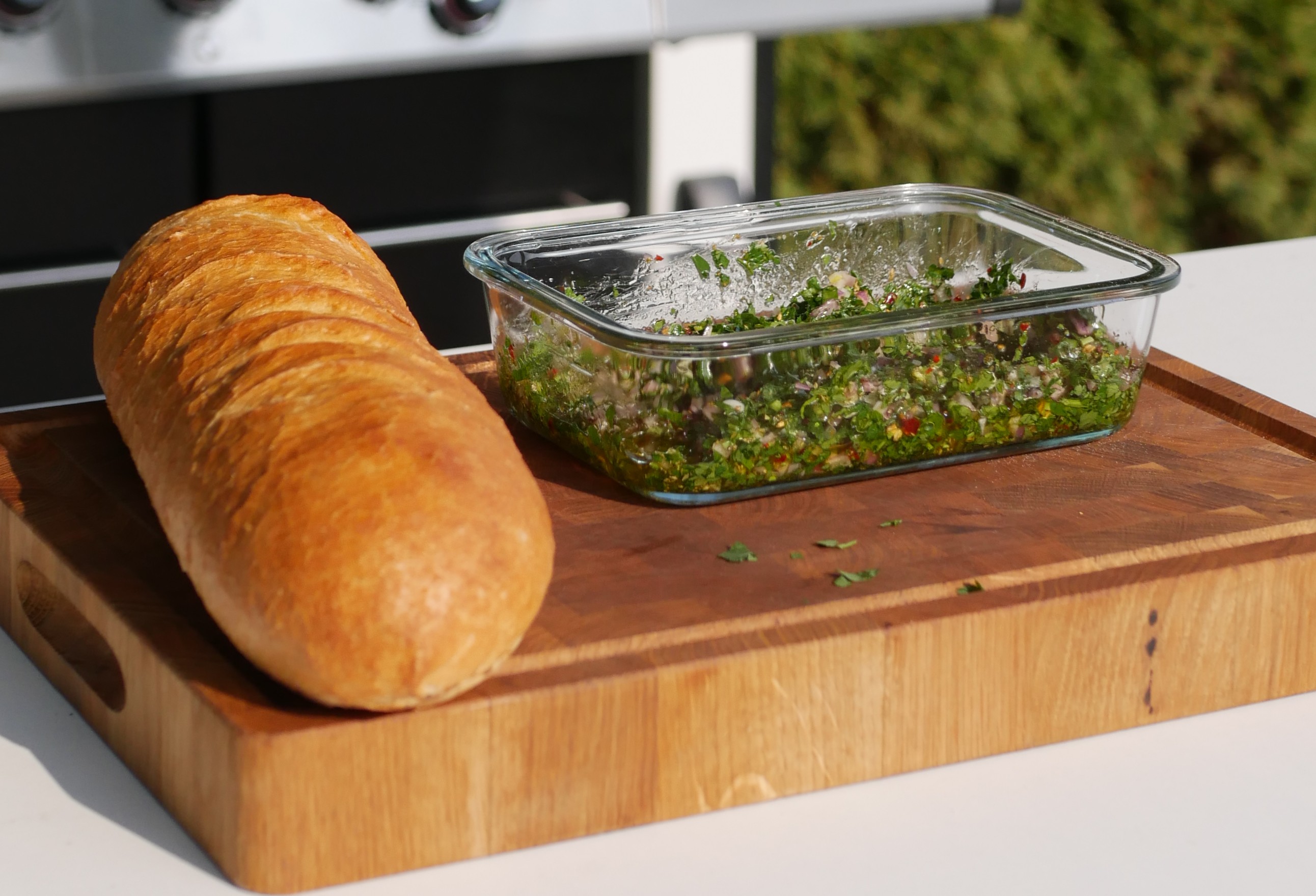 Przygotowanie potrawy rozpocznij od salsy chimichuri. Wykorzystasz ją do zamarynowania steku bavette, a następnie do wykończenia gotowej bagietki, nadając jej świeżości i wyrazistego charakteru.