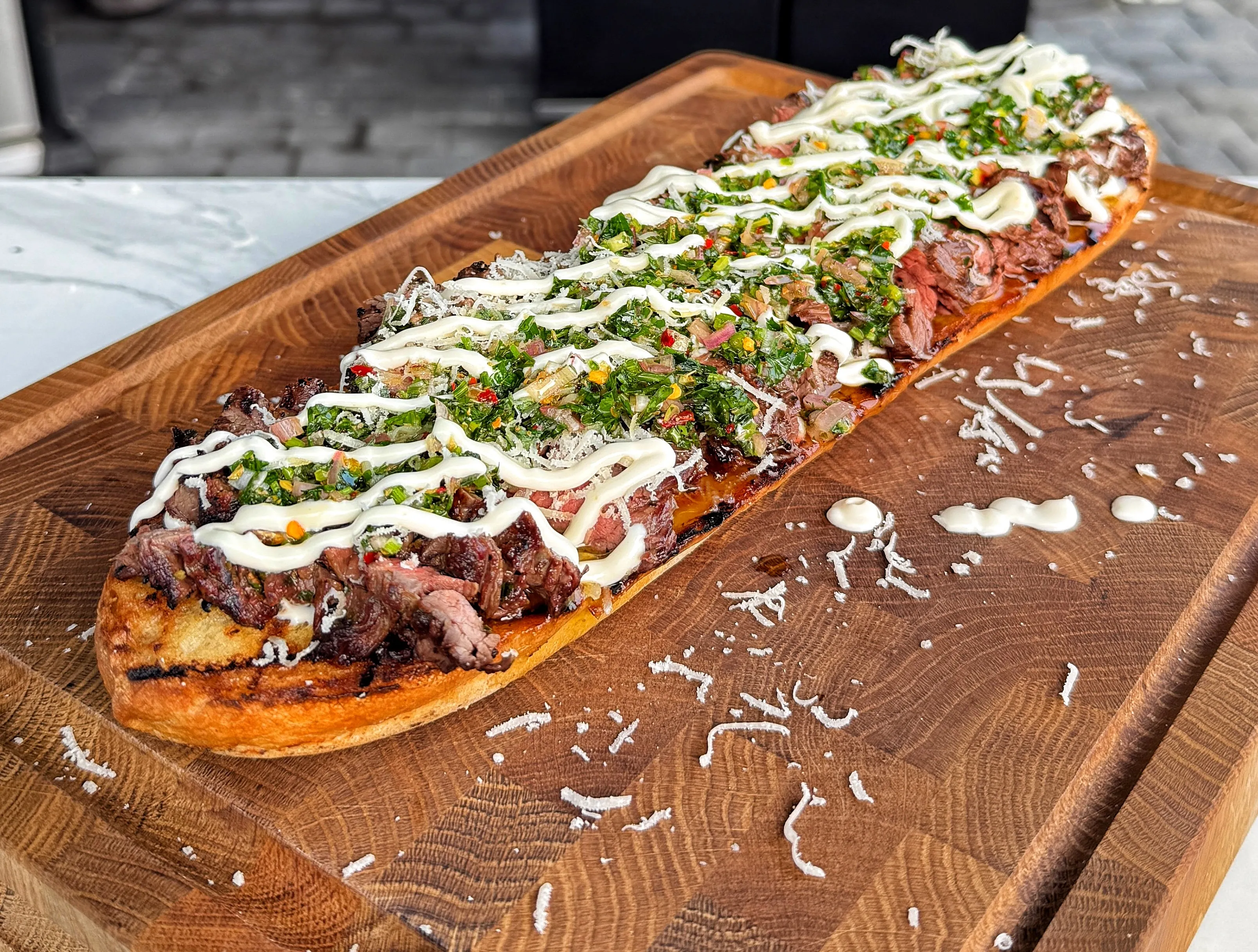 250-280°CGrillowana bagietka ze stekiem bavette to połączenie, które pokazuje, jak niewiele potrzeba, aby stworzyć coś naprawdę wyjątkowego. Soczysta, intensywna w smaku wołowina, chrupiące pieczywo i dodatki, które podkreślają charakter mięsa. Bavette, dzięki swojej strukturze i głębokiemu smakowi, idealnie nadaje się na grilla, wystarczy wysoka temperatura i kilka minut, aby uzyskać efekt, który trudno porównać z innym kawałkiem wołowiny. W połączeniu z aromatycznym chimichurri i delikatnym sosem czosnkowym tworzy kompozycję, w której każdy element ma swoje miejsce.