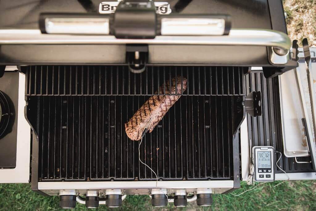 Ponieważ czas grillowania zależy również od warunków atmosferycznych, wagi mięsa i jego temperatury początkowej, dla pewności sprawdź temperaturę wewnętrzną mięsa za pomocą termometru z dwoma sondami. Jeżeli potrzebujesz podnieść ją jeszcze trochę lub wolisz mięso mocniej wysmażone, możesz położyć polędwicę jeszcze na kilka minut na górnej półce grilla. Drugim sposobem jest zwiększenie czasu grillowania każdej ze stron z 3 minut do 3:30 lub nawet 4 czy 5 minut. W zależności od tego, jakiego rezultatu oczekujesz.