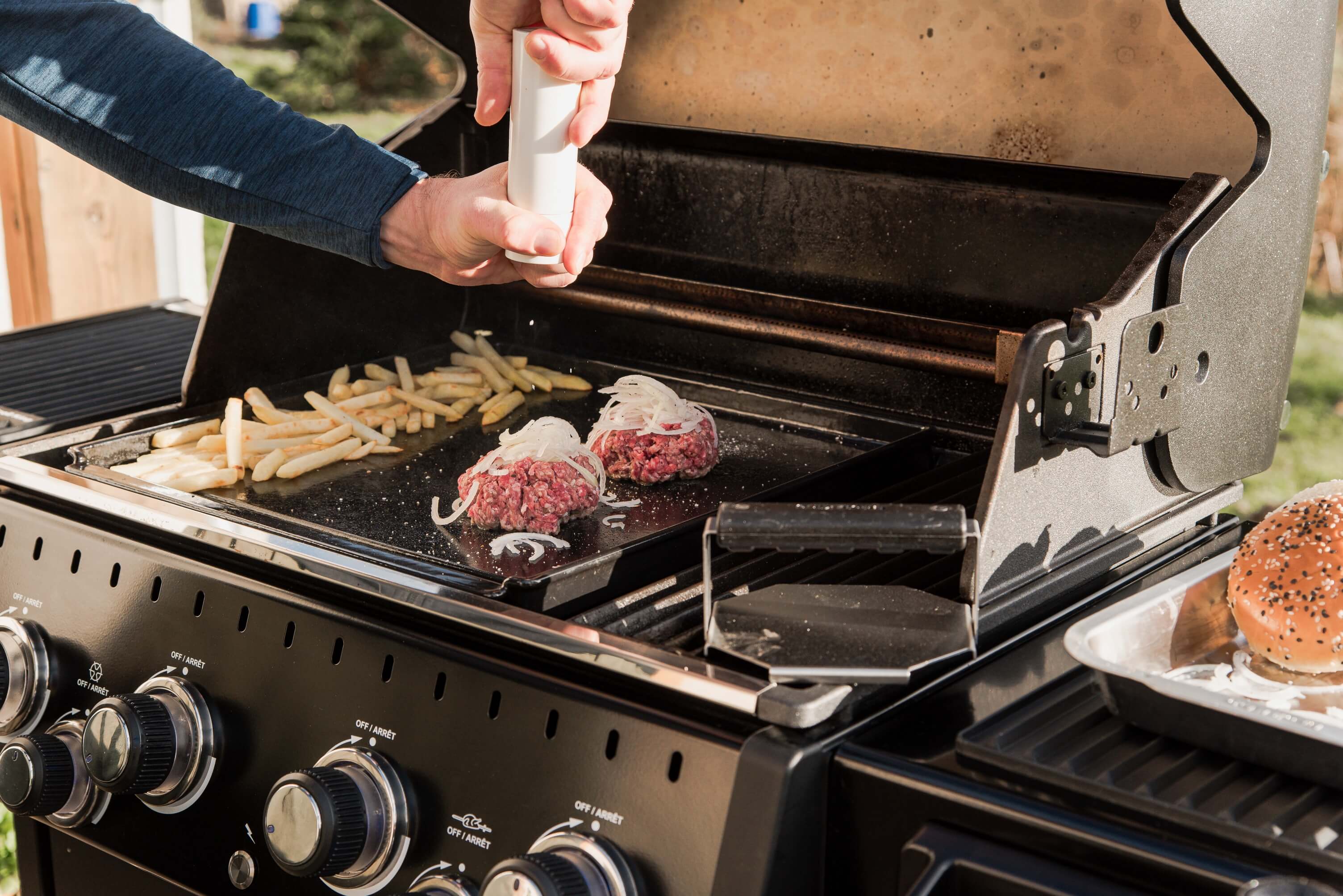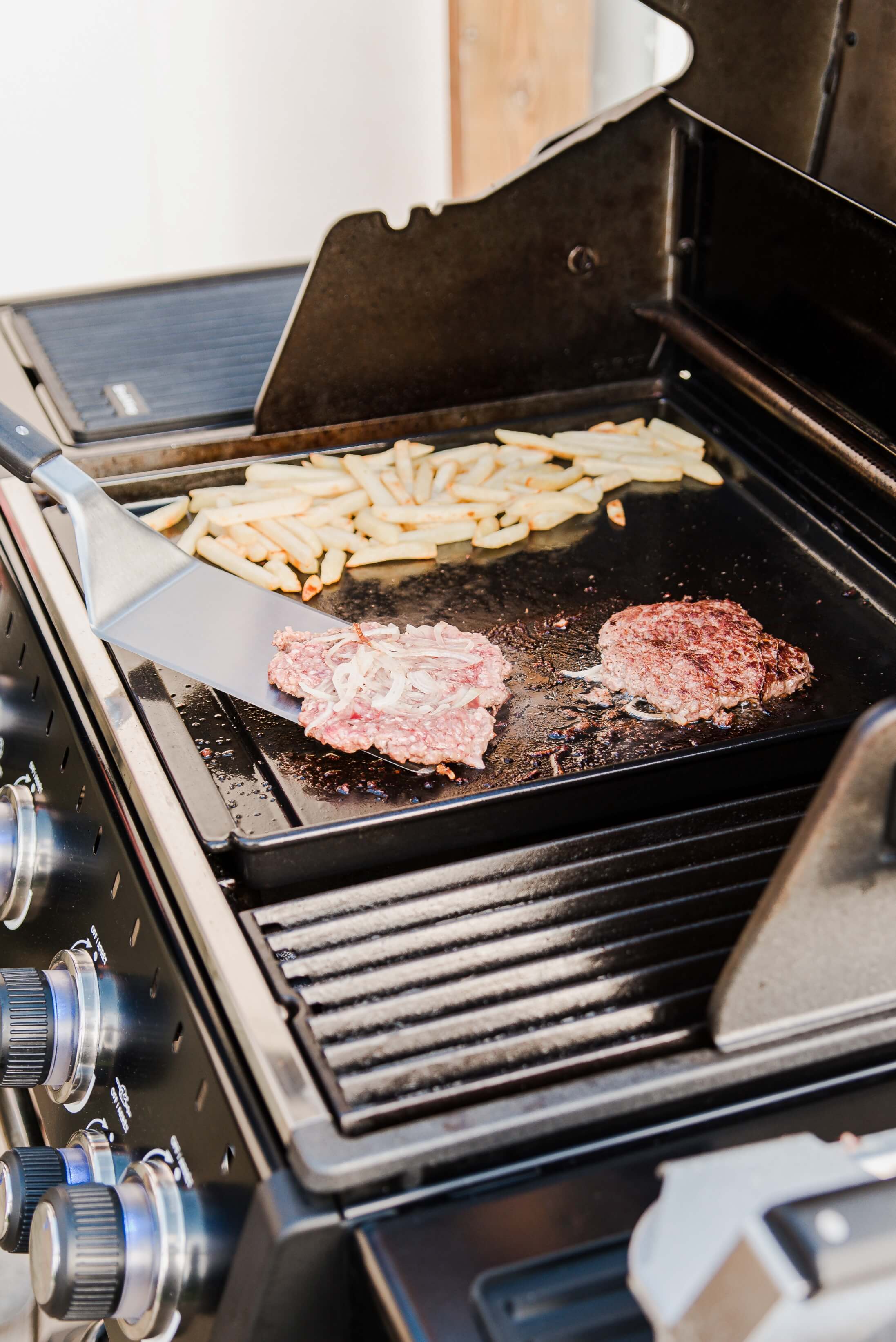 Pozostałe palniki podkręć do 260-300°C i podgrzej planchę tak, aby była bardzo gorąca. Z mięsa uformuj luźne kulki, nie ugniataj ich, mają być dobrze napowietrzone. Połóż lekko spłaszczone kule na planchy, na mięsie ułóż cebulę, oprósz solą i pieprzem.