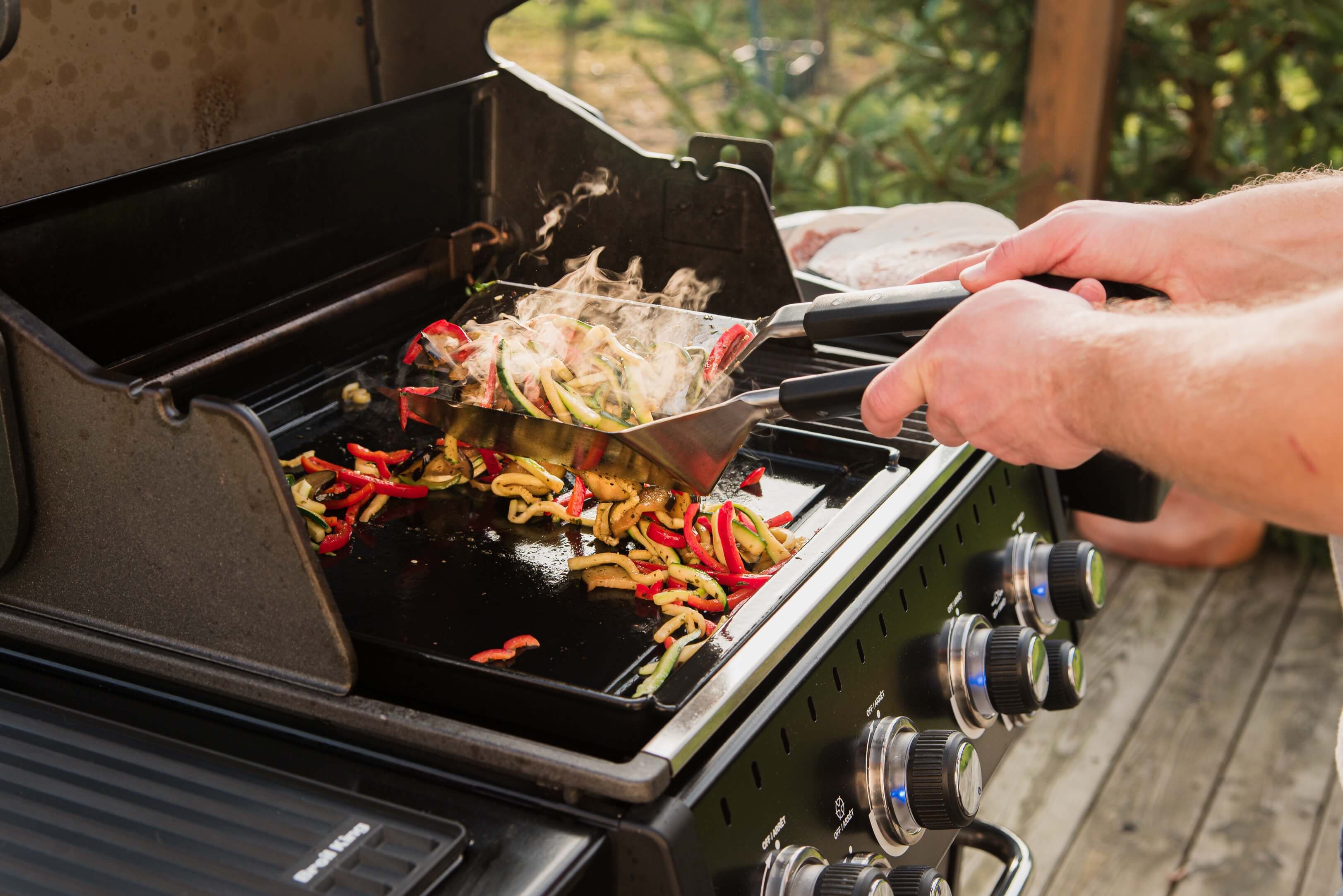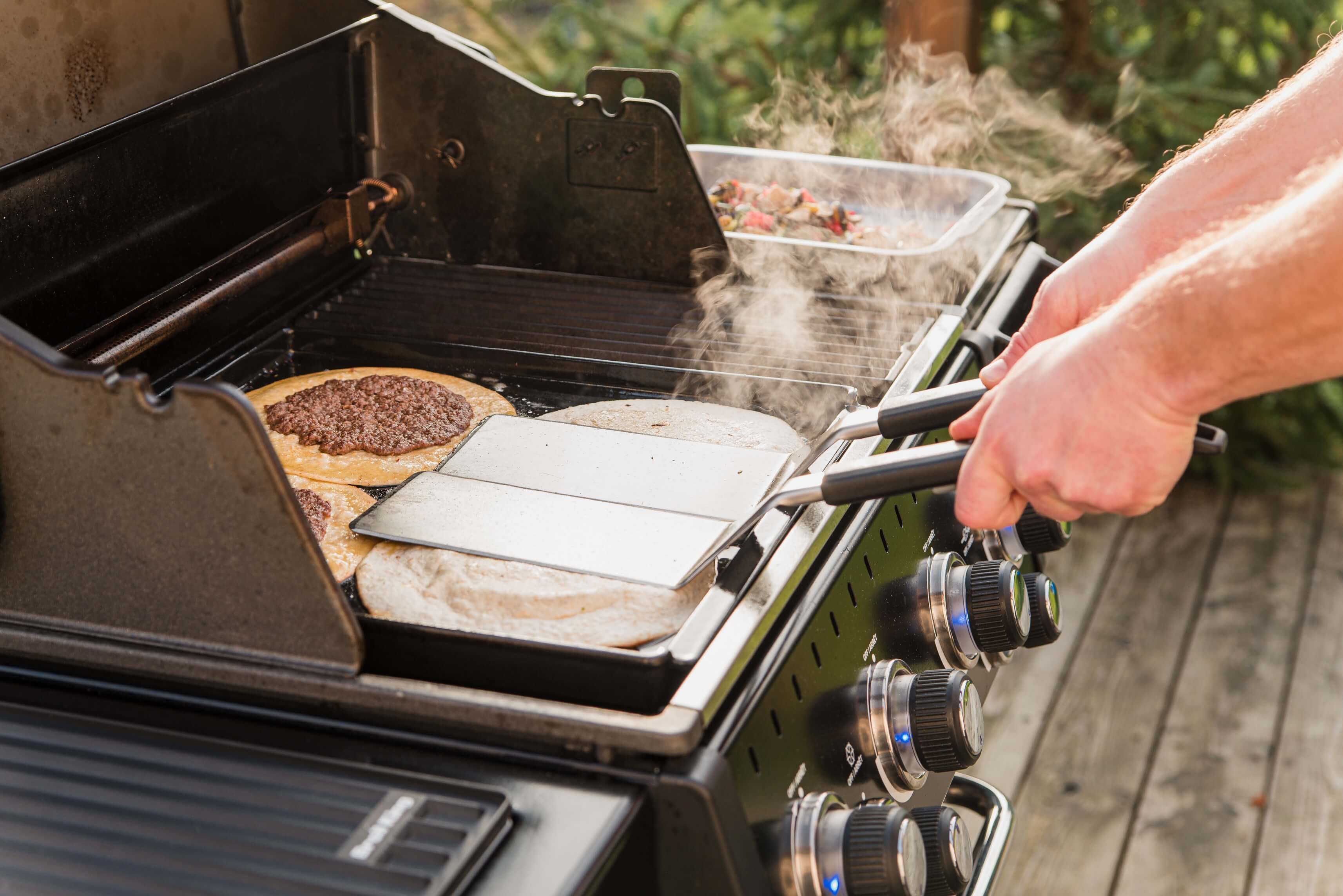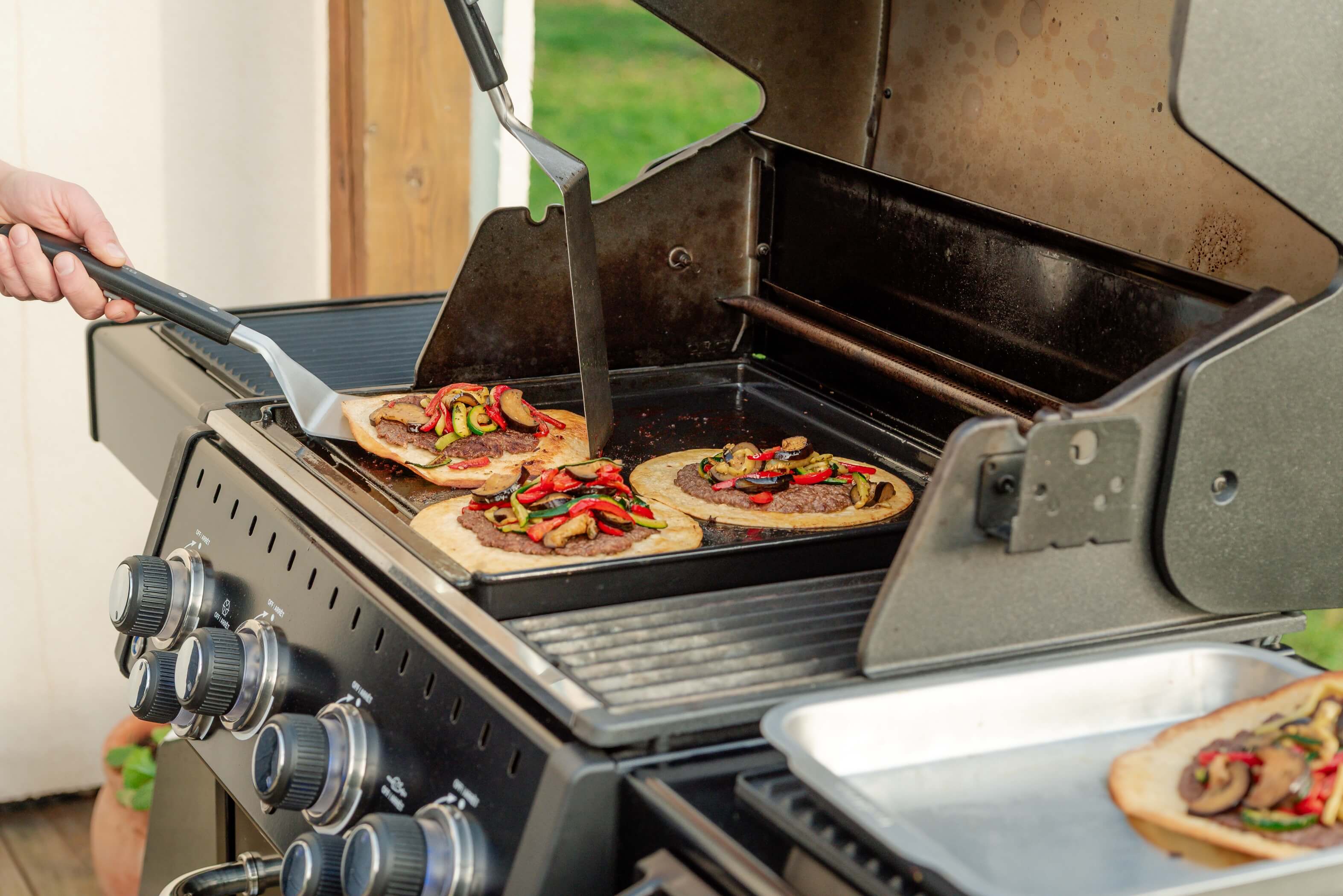 Za pomocą uchwytu wielofunkcyjnego wyjmij trzy kratki rusztu w grillu* i w ich miejscu umieść planchę. Następnie uruchom palniki pod planchą i rozgrzej ją do średnio-wysokiej temperatury.