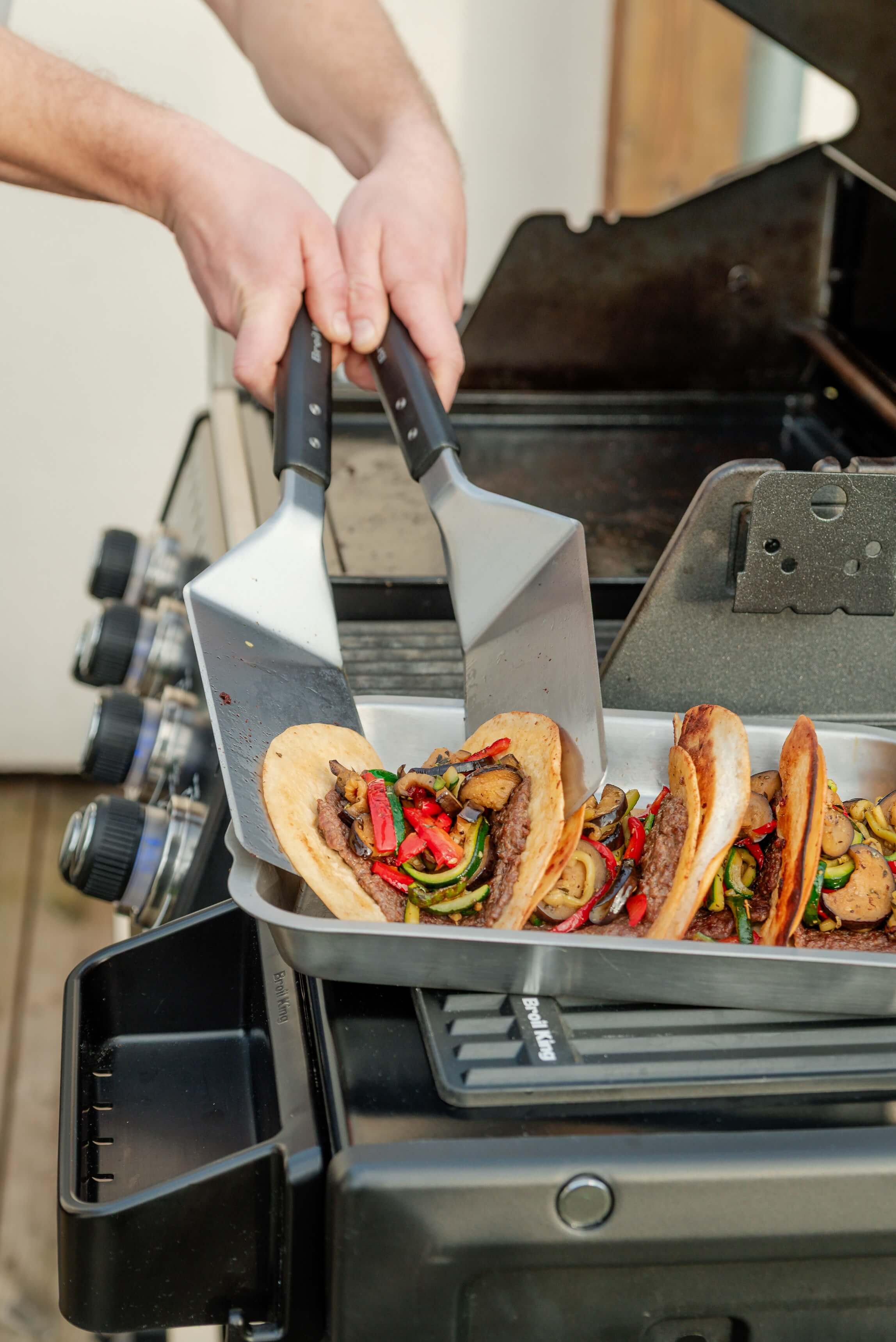 Na mięso wyłóż grillowanie warzywa i za pomocą dwóch łopatek przenieś tortille na stalową brytfannę.