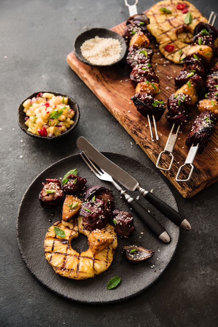 Rozgrzej grill do 250ºC, następnie grilluj pośrednio przez 8-10 minut w miedzyczasie obracając szaszłyki na grillu. 2-3 minuty przed końcem posmaruj szaszłyki pozostałą marynatą. Do grillowania najwygodniej będzie wykorzystać stojak i szpikulce znajdujące się w zestawie do szaszłyków (#69138) lub wpiąć podwójne szpikulce do szaszłyków (#64049) w górną półkę grilla. W czasie grillowania szaszłyków możesz przygotować dodatkowe kawałki ananasa, połóż je na rozgrzanym i natłuszczonym ruszcie oraz posmaruj je marynatą.